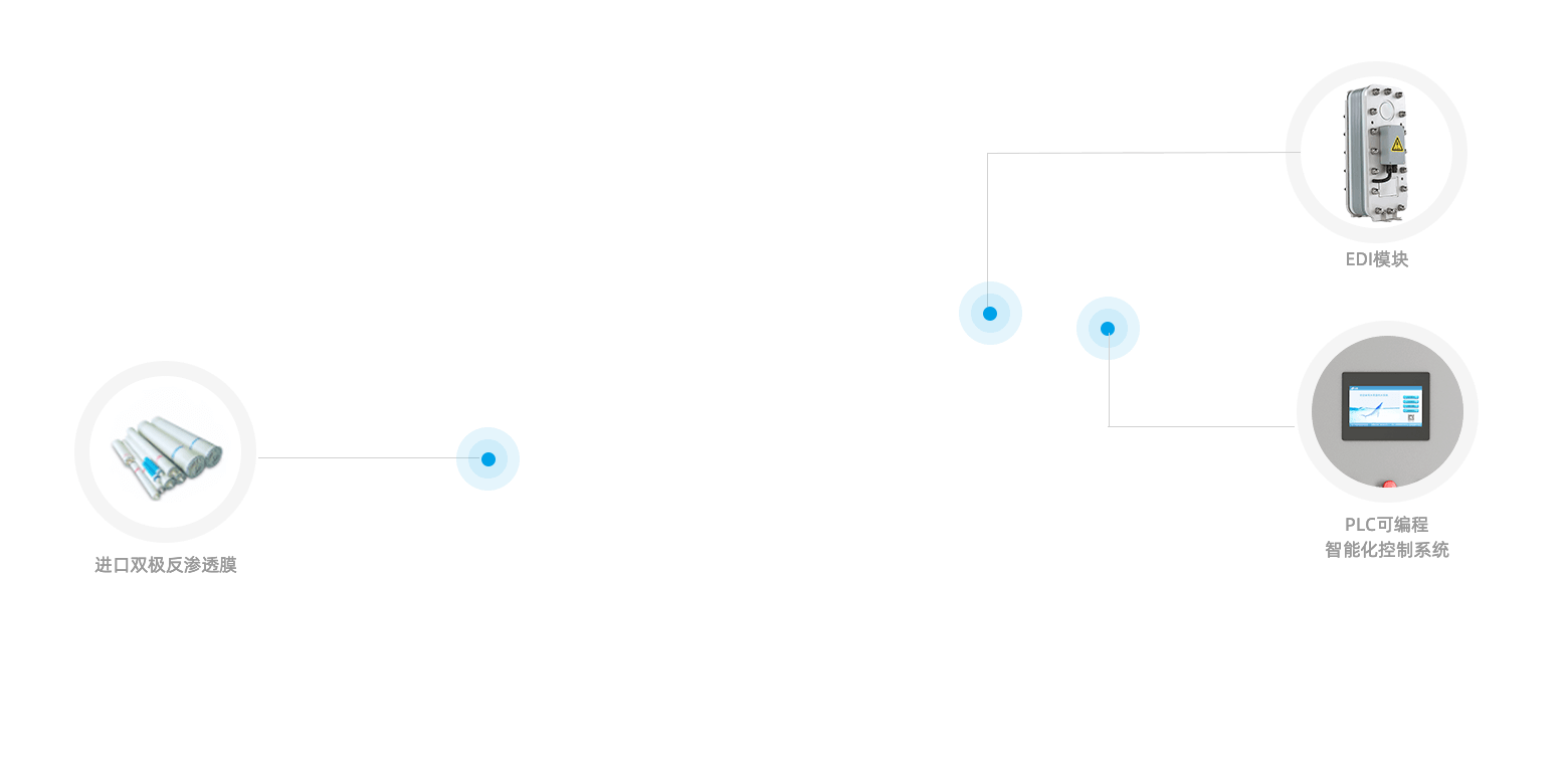 在使用RO滲透水脫除97~99%離子的前提下,EDI可直接將反滲透產(chǎn)水提純到純水、高純水、超純水的標(biāo)準(zhǔn),而無需使用離子交換混床,其產(chǎn)水的電阻率最高可達(dá)18MΩ·cm。